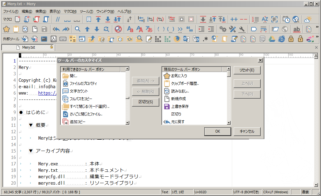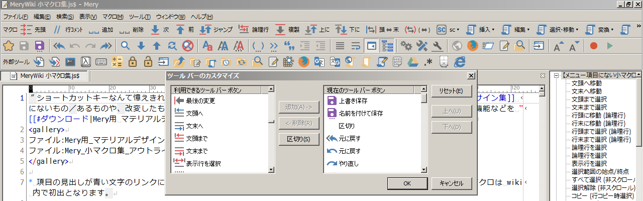”ショートカットキー なんて憶えきれない!” というマウス派の Mery ユーザーのために マクロライブラリ/キーアサイン集 に ないもの/あるもの や、改変したもの、Mery の メニュー項目 にあっても「ツールバーのカスタマイズ」に含まれていない機能などを Mery用 マテリアルデザインっぽいアイコン.icl